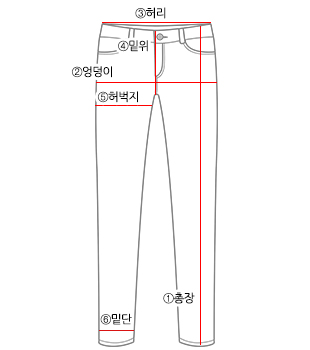 | 사이즈 | ①총장 | ②엉덩이 | ③허리(최소) | ③허리(최대) | ④밑위 | ⑤허벅지 | ⑥밑단 |